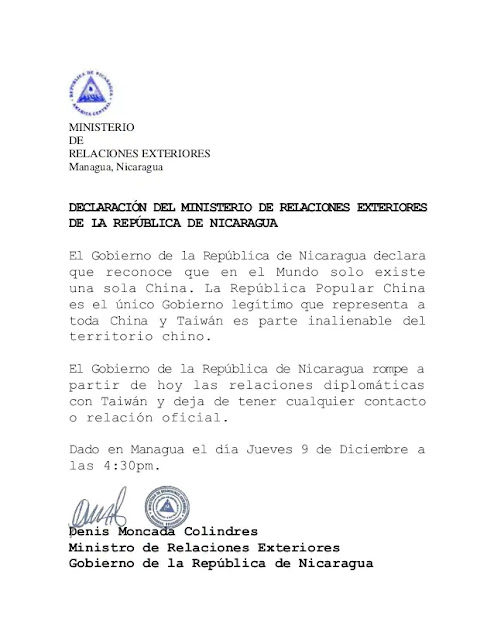 Από σήμερα, «Η κυβέρνηση της Δημοκρατίας της Νικαράγουα διακόπτει τις διπλωματικές σχέσεις με την Ταϊβάν και παύει να έχει οποιαδήποτε επαφή ή επίσημη σχέση», ανακοίνωσε ο υπουργός Εξωτερικών της χώρας της Κεντρικής Αμερικής.